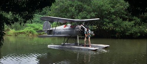 NC13075. A biplane with water pontoons, used by Jones to escape from the pursuing Hovitos tribesmen in South America. False registration OB-CPO (a reference to the Star Wars characters Obi-Wan and C-3PO).