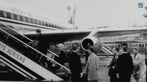 Must be one of the firsts flights between Japan and Paris. Not the same plane (note the window for the navigator).