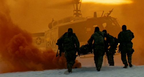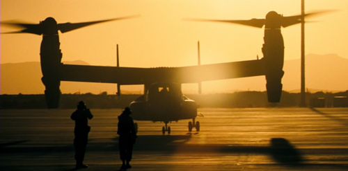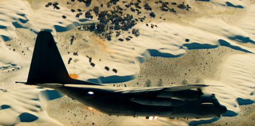 In this scene at 'SOCCENT Qatar', which is actually Holloman AFB, New Mexico;Lockheed C-130 Hercules, Lockheed F-117 Nighthawks, Sikorsky HH-60G Pave Hawks, Fairchild Republic A-10 Thunderbolt IIs and of course 'Blackout' - the Sikorsky MH-53 Pave Low.