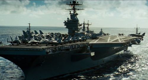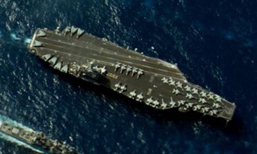 On the aicraft carrier you can identify McDonnell Douglas F-18 Hornets, Grumman C-2 Greyhounds and E-2 Hawkeyes, Northrop Grumman EA-6B Prowlers and Grumman F-14 Tomcats.