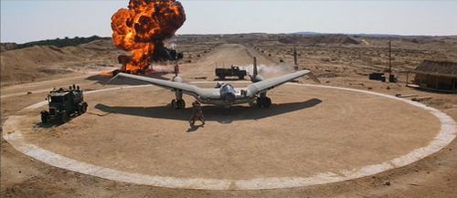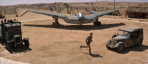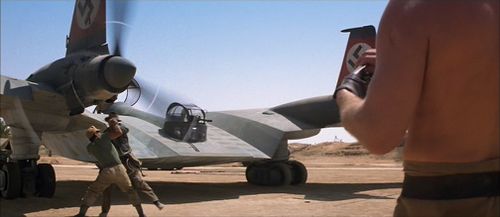 The Nazis attempt to transport the Ark from Tanis to Germany via this airplane. Following an attempt by Jones to board it, it is destroyed in an explosion. It is a fictional prop, based on historical Northrop Corporation designs and drawings by Ron Cobb of the Horten Ho 229. It also appears to have some inspiration, however subjective, from the Arado E.555/1 six-jet (BMW 003s, like those used on real-world Heinkel He 162A Spatz) long-range, jet-powered flying wing bomber design of late 1944.