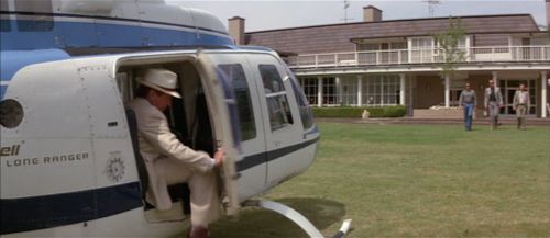 Wesley arrives at his lakeside mansion riding in a Bell LongRanger, and has his pilot do a low flyover of his neighbor's farm across the lake to spook the horses.