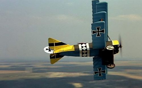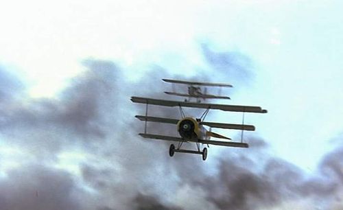 When action is set twenty years later in a restaurant, a paint on the wall features the two aircraft (R.A.F. S.E.5A and Fokker Dr.I) at the first stage of this dogfight.
