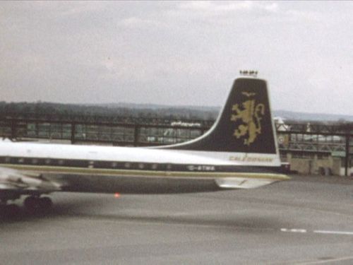 BUA's BAC-111-201AC One-Eleven behind, and another Caledonian's Bristol Britannia in the far background.