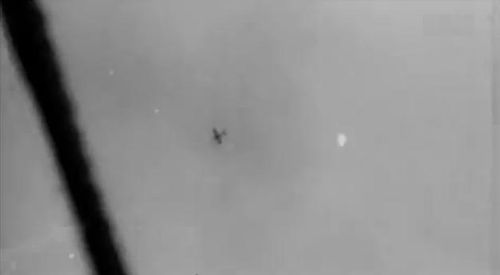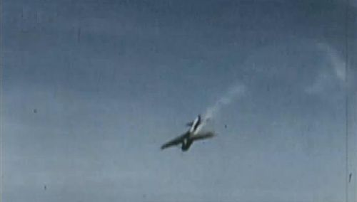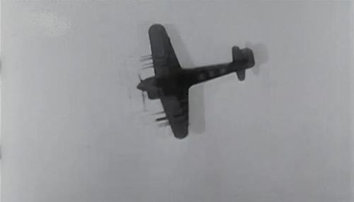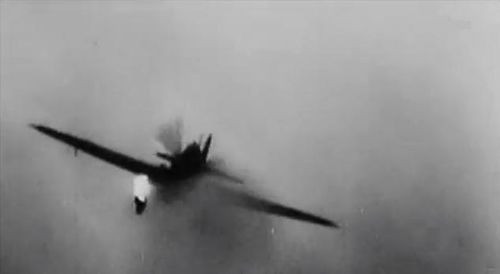 As the narrator speaks about the Battle of Britain, an unknown aircraft tracked by spots.