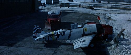 "German" fighter planes seen at Oberhausen Airfield (in fact, loaned Austrian Air Force trainers). Smith cripples them by running into them one at a time with the bus so they can't take off and follow the Junkers.
