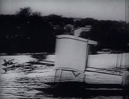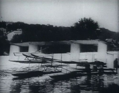 Trial for taking off from the Seine river in 1905. The glider was towed by a motor-boat.