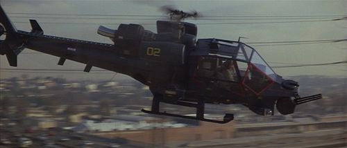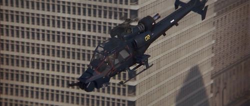 Cochrane comes after Murphy personally in a helicopter equipped with machine guns. Registration N58428, Serial 1290624D, also seen in other movies at IMPDb: Frequently Seen Aircraft. After a lengthy pursuit, Murphy performs a loop with Blue Thunder and shoots Cochrane down.