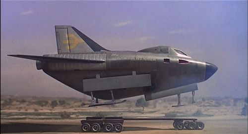 Apart from the dorsal accordion, this large aircraft looks almost plausible. It can be seen in the background of later shots, where it appears to have a forward swept cruciform tail.