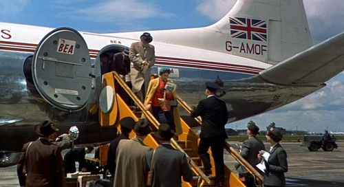 Arrival of Benjamin and Josephine McKenna at London in a Vickers Viscount of BEA. A Convair 240 of SABENA-Société Anonyme Belge de Navigation Aérienne on the right in the foreground.