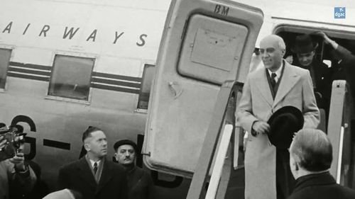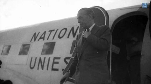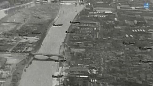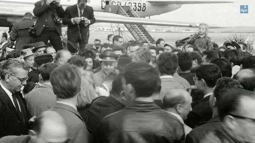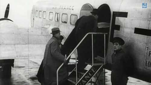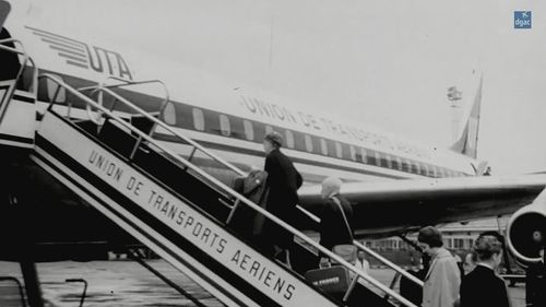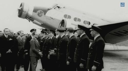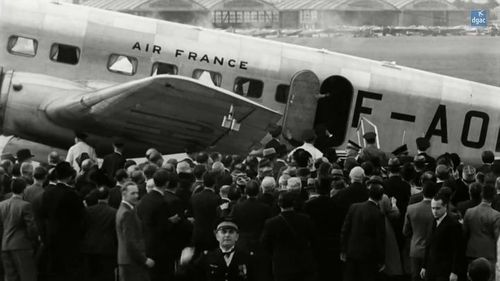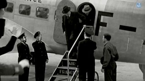 Must be one of the firsts flights between Japan and Paris. Not the same plane (note the window for the navigator).