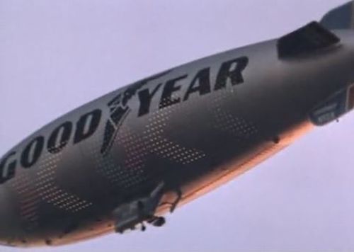 Reg. N10A Goodyear GZ-20. Several Goodyear blimps wore this registration. This is probably an archive footage of America (1969-1982) as Columbia (VIII) (1986-1992) and Spirit of America (2002- ) have a blue envelope.