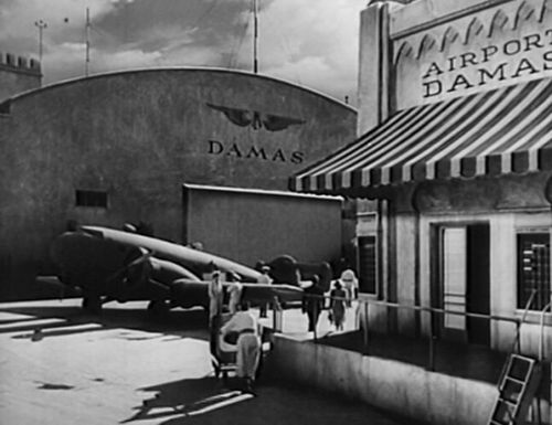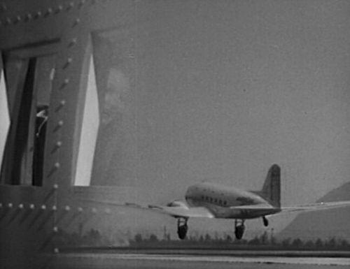 George Sanders is on board the Capelis XC-12, waving the hand through the window and here is the continuity error : next, a Douglas DST from American Airlines is taking off.