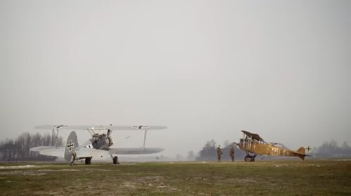 LVG C.VI of the Royal Air Force Museum, Cosford, England (G-AANJ). Loaned by The Shuttleworth Collection (29 October 1981 - 12 November 2003) in a flying condition despite only seen on the ground in this movie. On static display only since 2003 and under restoration in 2016. During this work, it was discovered that the aircraft was the assembly of several airframes (when ?). Until that, this plane was reputed to be a war prize from the Imperial German Air Service (s/n 7198/18). But due to lack of space at Imperial War Museum stored dismantled in the basement of the Science Museum, South Kensington (1924-1932). Restored to flying condition two times : in 1937 then 1965-1972.