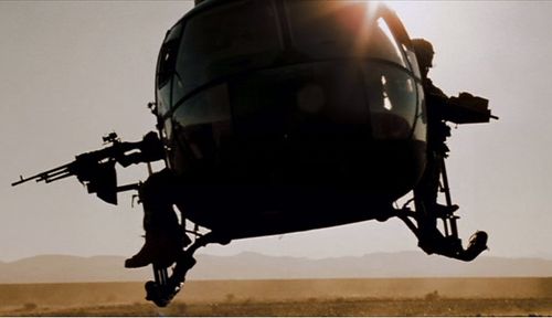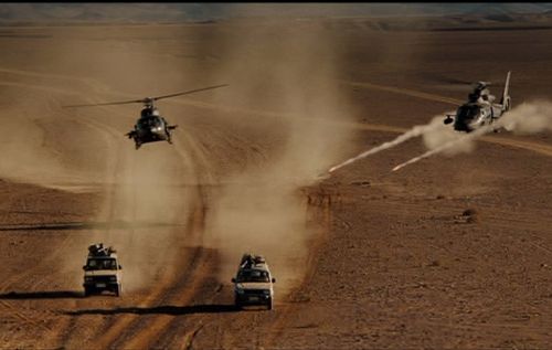 Seen during the car chase in Iraq, both models can be seen with the N model having the armament pylons. All helicopters including camera ship being an Eurocopter AS350 provided by Heli Air Monaco.