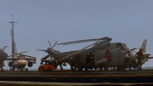 Two grey Northrop Grumman EA-6B Prowlers are guessed behind the Sea King tail rotor and on the left edge of the screenshot.