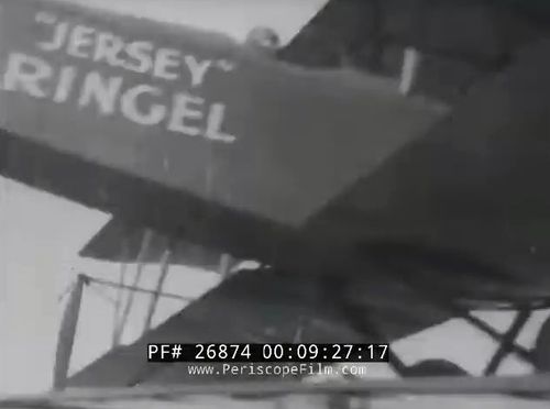 Phil "Jersey" Ringel, pioneer aviator and stunt flier,standing on wing of a Curtiss JN-4 Jenny. He died following an airplane crash in 1930, ironically it was a routine flight and not a stunt performance.