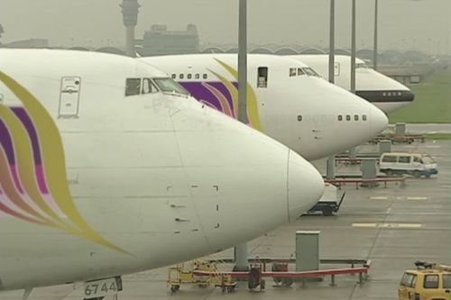 China Eastern Airlines A310 facing a Singapore Airlines Cargo Boeing 777-300ER both under a Solar Airways Boeing 747.