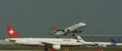 At Aéroport de Paris-Charles de Gaulle in front of Roissy 2 building : an A320 of Swiss, and another one from Austrian Airlines taking-off behind. On the right in the background, a 4 engines A340 of AOM, with tail of a Delta Air Lines 777