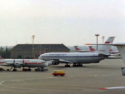 Ilyushin Il-18 and Ilyushin Il-62 of Interflug all around. Partly seen on the right foreground , tail fin of Tupolev Tu-154.