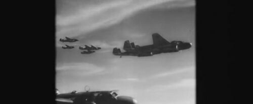 Large formation of four-engine bombers with twin tails (Avro Lancasters?) escorted by single-engine fighters.