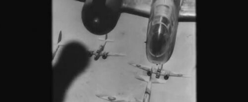 Supermarine Spitfire (Mk V or Mk VIII?) fitted with a Vokes Aerovee sand filter. Same footage in other works at IMPDb: Frequently Seen Aircraft (Military Fixed-Wing).