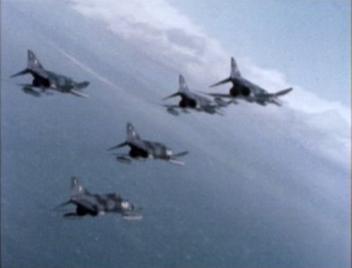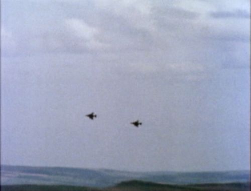 The Brigadier calls in the RAF to drop bombs on the giant maggots. The production team were planning to get an RAF Phantom to fly over but they couldn't afford it (and they didn't want to use stock footage), so this was used instead.