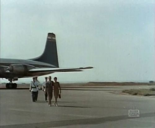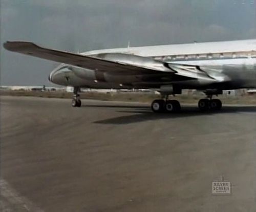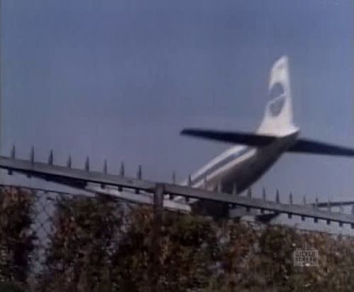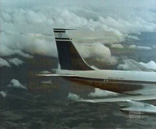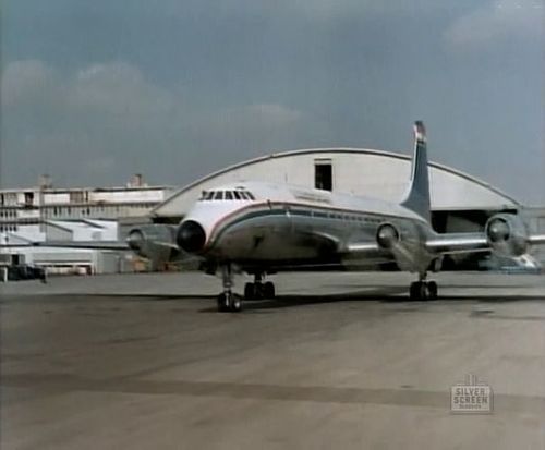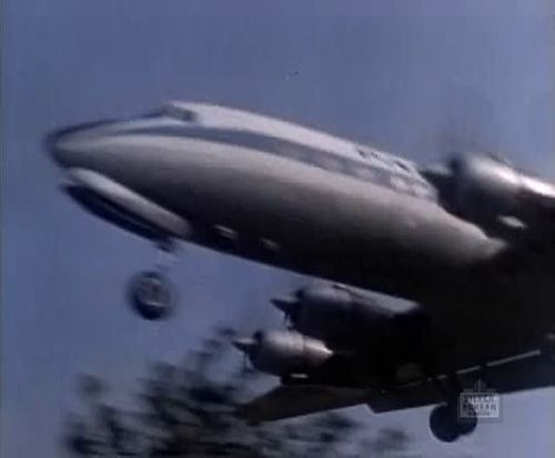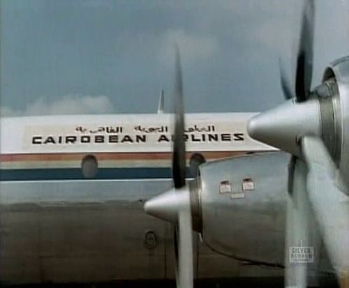 Cairobean Airlines is fictional. The "B" on the wheel well clues us in to this aircraft's real identity: registration 4X-AGB, c/n 13233 built in 1957. Operated by El Al Israel Airlines and heavily repainted for filming.
