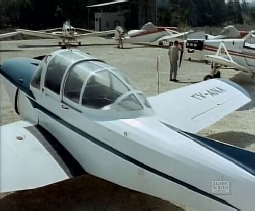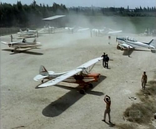 In the background, Fokker S.11 listed below on the right, and five Piper PA-25 Pawnees encircling to its left.