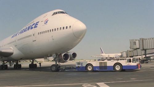 (Background) First with an Air France Boeing 747 docked to one of the satelite of Terminal 1 at Aéroport de Paris-Charles de Gaulle.