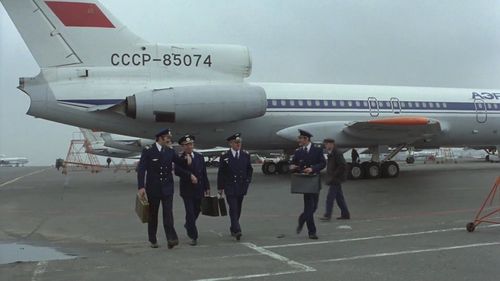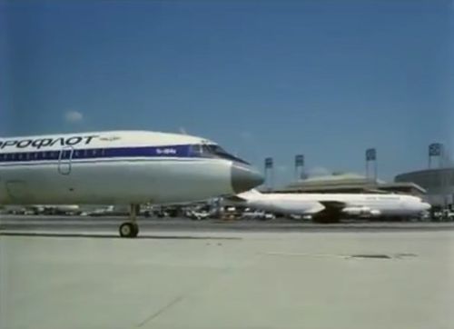 But the airframe in flames is the central part of a Tupolev Tu-114 (note the space between windows over the wing). This is a Continuity error : the Kuznetsov NK-12MV turboprops removed, the ill-fated twinjet is now a four engined burning plane ...