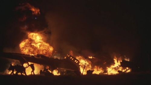 Explosion and fire of the airliner (now clearly identified as a Tupolev Tu-114 minus its engines).