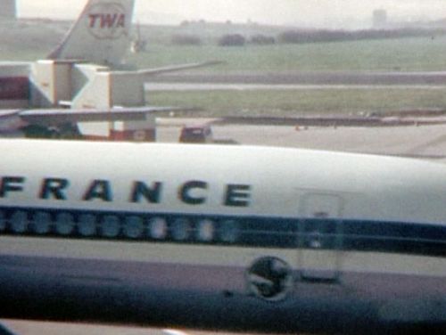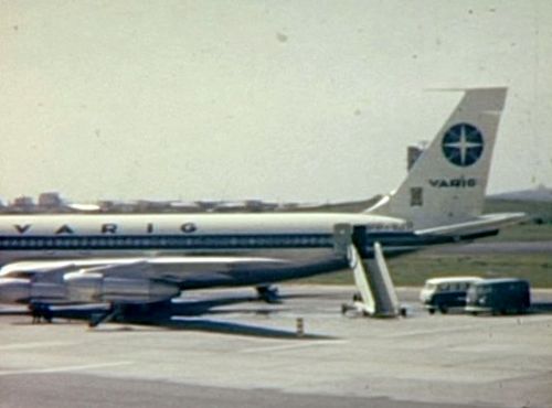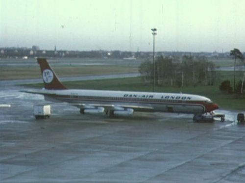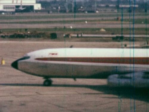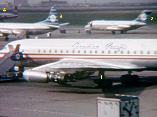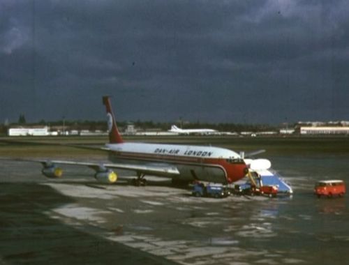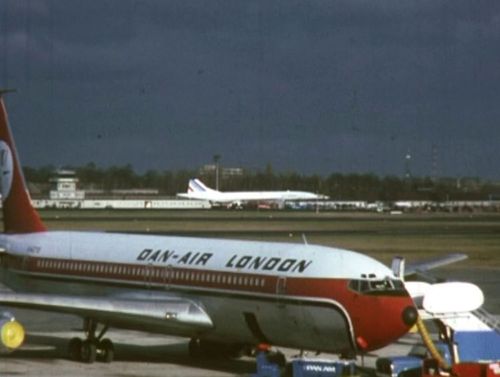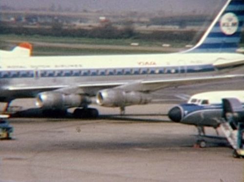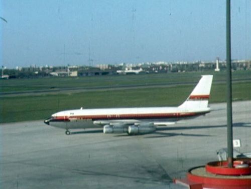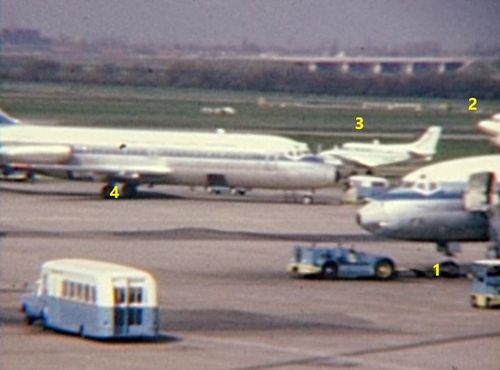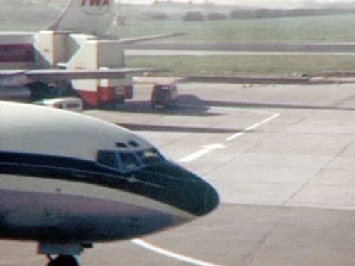 In the far background, Boeing 707 possibly from TWA. Foreground right nose of BEA's Vanguard.