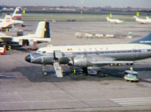 In background, BEA's Vanguard and Comet 4B beside a SAS's Sud Aviation SE 210 Caravelle III which hides a Boeing 707 of Lufthansa to the right.