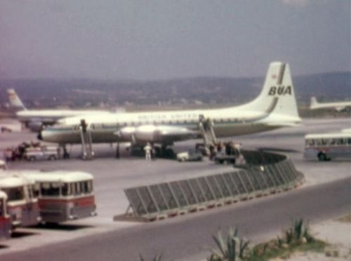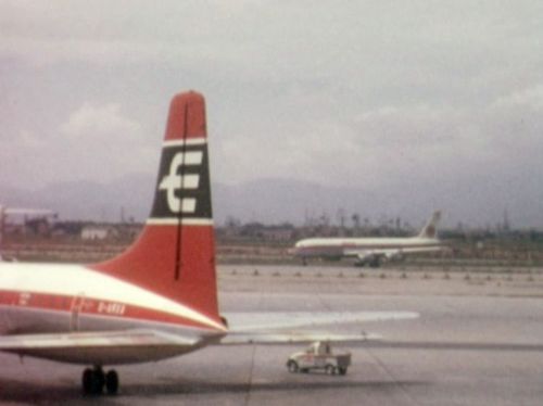 Our ramble round Europe takes in British Westpoint and Aer Lingus DC3s at Heathrow plus many other 60s airliners there, including an Iraqi Viscount. On to Lisbon for Varig and Pan Am 707s, CPA DC8 and various 727s. Then Schiphol, again in the mid -60s, with KLM DC8s, DC9-15s and Electras, MAC DC7Cs, DC3s and CV600 and more. Palma, at about the same time, has a bevy of Britannias; Laker, BKS, BUA, British Eagle and Transglobe, plus more classic jetliners.
