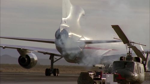 Behind the broken tail of a Lockheed L-1011 TriStar, a McDonnell Douglas MD-88 of Continental Airlines. On left and right borders, two McDonnell Douglas DC-10. About the fifth aircraft, see next section.