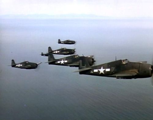 This shot is taken from a Lockheed PV-1 Ventura (note the wingtip in the upper left) flying with these FU4 Corsair.