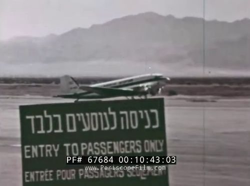This 1958 travelogue Follow the Sun to Israel presents sunny Israel as an attractive destination to escape the winter in the USA. It follows a couple on a trip through the country and begins with their arrival at Lod Airport aboard an El Al flight.
