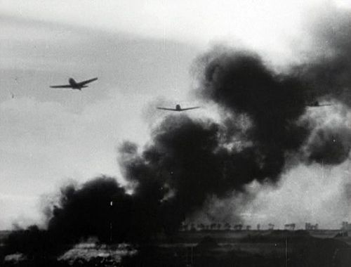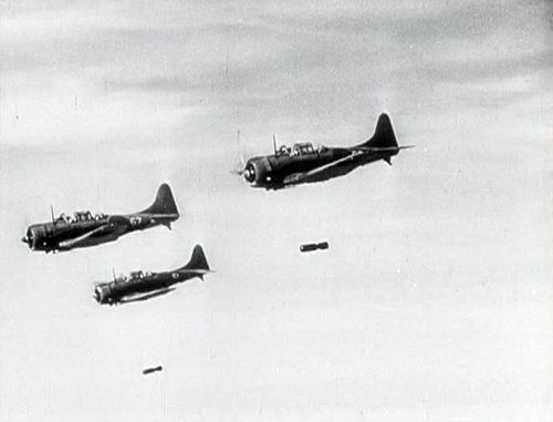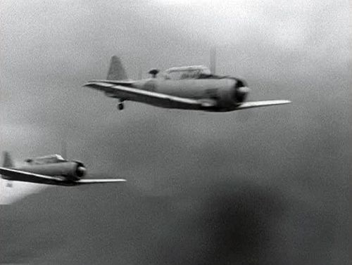Wild guess, but these aircrafts having fixed undercarriage may be Japanese Aichi D3A from archive footage.