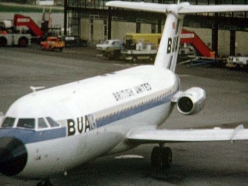 BUA's BAC-111-201AC One-Eleven and tail fin of a Britannia Airways's Bristol Britannia in the background.