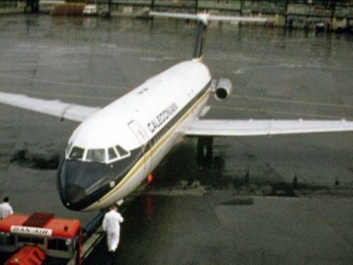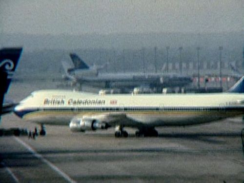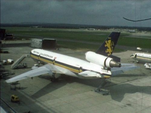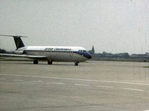 A BAC-111-509EW One-Eleven of Caledonian Airways is taxiing behind it (listed below), with another Caledonian Airways airplane in the background that seems to be a Boeing 707, and at least a BAC-111 One-Eleven in in the far background to the right.