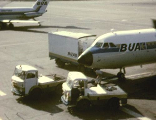 BUA's BAC-111-201AC One-Eleven behind, and another Caledonian's Bristol Britannia in the far background.