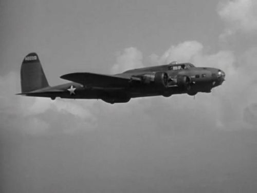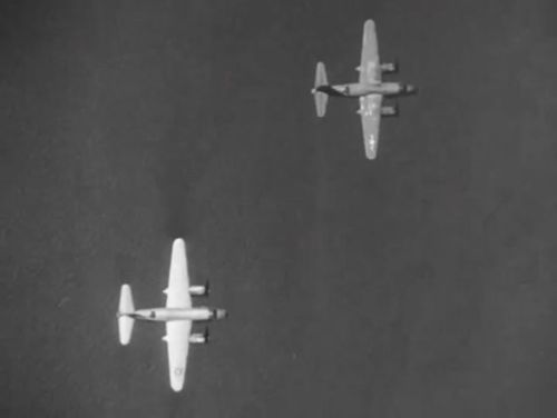 Just under the Curtiss-Wright C-46 Commando, a blurred Consolidated B-24 Liberator.