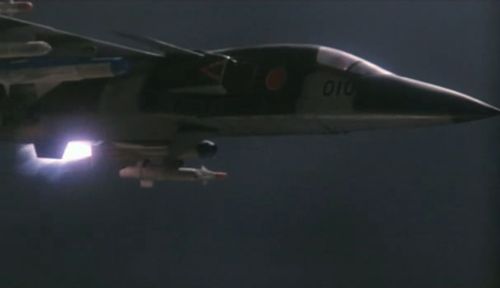 The Japanese air force attacks Godzilla in Tokyo Bay with these in time-honored fashion. He destroys a few of them with his fiery nuclear breath. Save for cockpit shots featuring the pilots, they're represented by models with fictionnal canard plan.