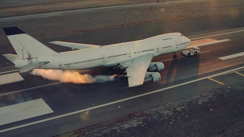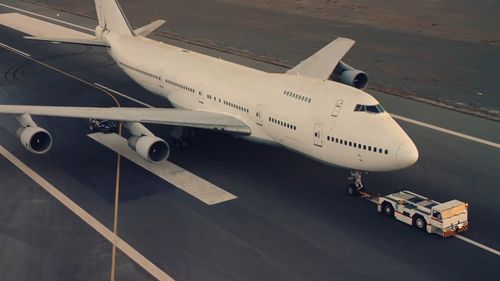 Seen in the background at least two Boeing 747s, one twin engine helicopter (Bell 412 with a undernose pod (camera?)).