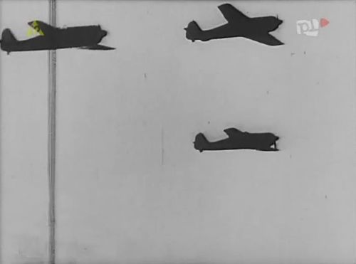 Footage of a flypast used to symbolise a Luftwaffe raid. But shapes are more probably from Handley Page HP.52 Hampden follow by Hawker Hurricane rather Messerschmitt Bf 110 and Bf 109