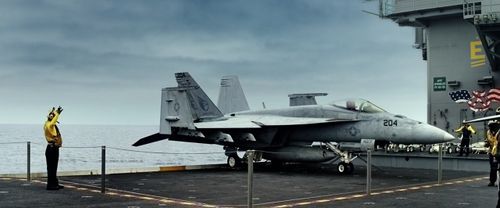 Next scene and we see again an American aircraft, a Boeing F/A-18 Super Hornet; please note the different castle in the background.