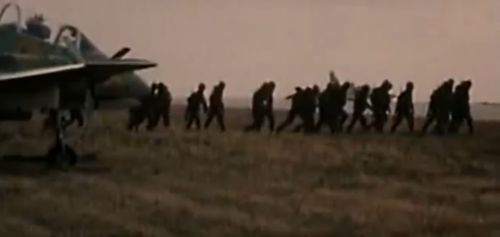 In the distance, behind the argentinian soldiers, the shape of an Aermacchi MB-339 of the Comando de Aviación Naval Argentina (Argentine Naval Aviation).