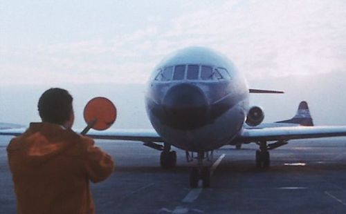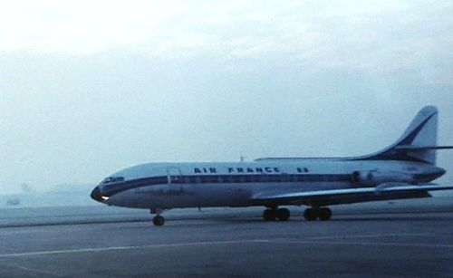 A Vickers Viscount of Austrian Airlines passing behind this Caravelle.