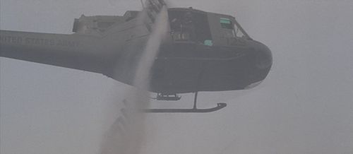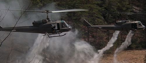 Stock footage from the 1976 movie is used to recap Kong's supposed death atop the World Trade Center in the first film. Later, several Iroquois are used by Colonel Nevitt's forces to spray Kong and his mate ("Lady Kong") with knockout gas.